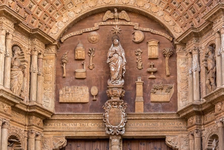 The Cathedral in Palma is really called Catedral-Basílica de Santa María de Palma de Mallorca or simply, Catedral de Mallorca. Locals call it La Seu. Above the main portal we find the inscription Non Est Factum Tale Opus In Universis Regnis (There is nothing like it in any kingdom). After an earthquake in 1851, this Western facade had to be rebuilt and was subsequently designed by the architect, Juan Bautista Peyronet. The exquisite stonework was extensively restored some ten years ago. The photo was taken in Palma de Mallorca, Baleares, Spain. The date: January 9th, 2014.